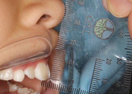 | 診断結果 | 拝見したところ、乳歯が隙間なく密集して生えている状態でした。 通常、乳歯の時期には歯と歯の間に発育空隙(はついくくうげき)と呼ばれる自然な隙間や、犬歯の前後に霊長空隙(れいちょうくうげき)と呼ばれる特徴的な隙間があります。 この隙間は、将来永久歯が生えるために必要なスペースを確保するためのものです。 しかし、患者様はこれらの重要な隙間がほとんど見られませんでした。 今のままでは、今後永久歯が適切な位置に並ぶためのスペースが不足すると考えられます。 以上のことから、永久歯への生え変わりをスムーズに進めるためにも、早急に治療を開始する必要があると診断しました。 |