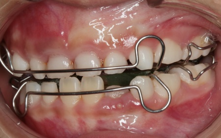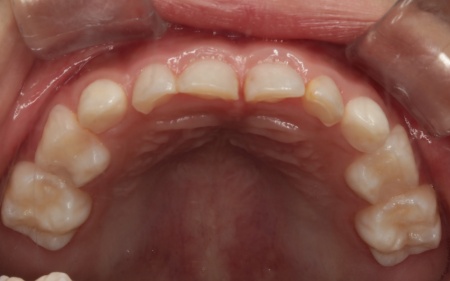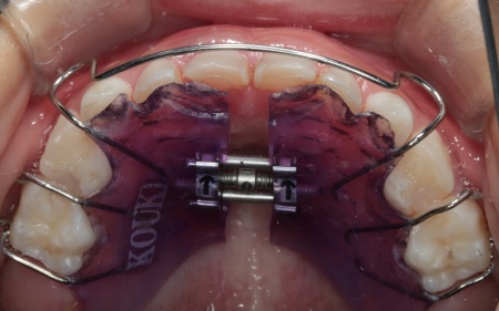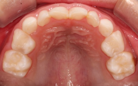 | 行った治療内容 | 患者様の保護者様は早期の治療を希望されていたため、5歳になったタイミングで1期治療を提案しました。 1期治療とは、お子様の成長を利用して骨格的なバランスや歯並びなどの改善を図る小児矯正のことです。 今回の治療では、床(しょう)矯正装置のひとつである「拡大床」という装置を使用した治療法をおすすめしました。 床矯正装置とは、プラスチックの土台部分がある取り外し式の矯正装置の総称です。拡大床は、そのなかでも顎の幅を拡大することを目的とした装置で、中央に組み込まれたスクリューと呼ばれるネジを少しずつ回すことで、顎の横幅を徐々に広げていきます。 メリット ・取り外し可能なので食事や歯磨きがしやすく、日常生活の負担が少ない ・成長期の顎の発育を利用するため、永久歯が生えるスペースを自然なかたちで確保できる ・スクリューを調節することで段階的に顎の幅を広げる方法なので、無理なく治療を進められる デメリット ・取り外し式の装置なので、決められた装着時間を守る必要がある ・スクリューの調整と口腔内の経過観察で、定期的に来院いただく必要がある メリットとデメリットを丁寧にお伝えし、治療に同意いただきました。 まずは患者様専用の拡大床を製作し、装着を開始します。 治療中は、スクリューを少しずつ回すことで顎の骨が徐々に横方向に拡大されていき、永久歯が生えるためのスペースを十分に確保することができました。 拡大治療が完了したあとは、顎の状態を安定させるためのリテーナー(保定装置)を装着し、治療を終了しています。 |