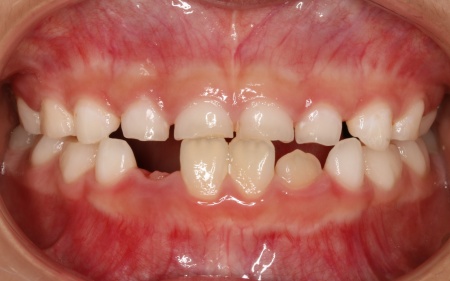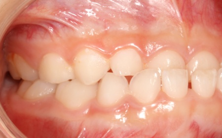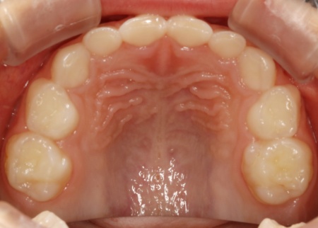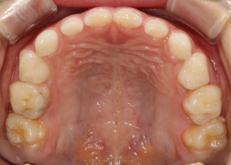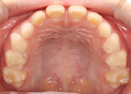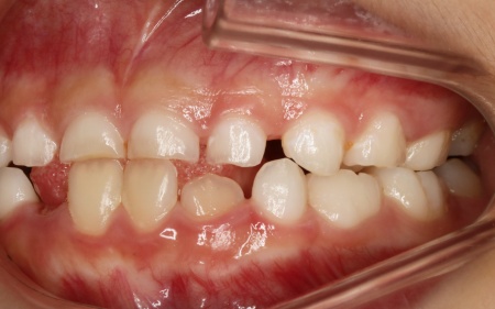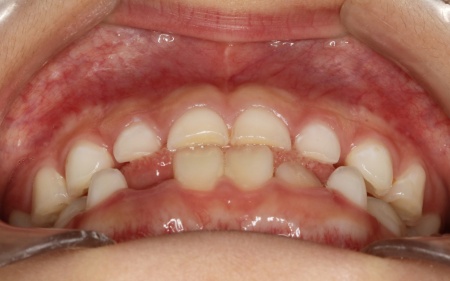 | 診断結果 | 拝見したところ、患者様は乳歯のみが生えている乳歯列期の段階でしたが、この時点ですでに反対咬合が認められました。 反対咬合とは、下の前歯が上の前歯よりも前に出ている状態のことで、一般的に「受け口」とも呼ばれます。 反対咬合は、このまま放置すると永久歯に生えかわったあとも継続してしまうおそれがあり、顎の成長や噛み合わせ、発音や顔貌にも悪影響を及ぼすことがあります。 しかし、この時期は顎の骨が成長段階にあり、適切な治療を行うことで改善が期待できるため、早期に治療を開始する必要があると診断しました。 |