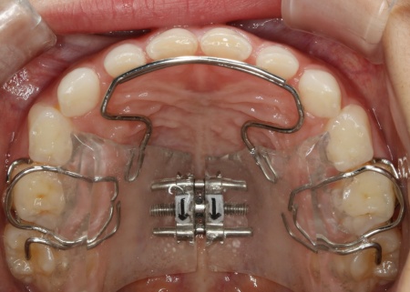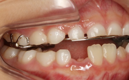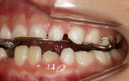 | 行った治療内容 | 患者様には、上顎の骨を前方に成長させることで反対咬合を改善する治療方法を提案しました。 乳歯列期から治療を始めることで、顎の自然な成長を利用しながら、より効率的に反対咬合を改善することが可能です。 その一方で、以下の注意点も併せてお伝えしています。 ・装置は着脱式なので、装着時間を守る必要がある ・装置に慣れるまでは、違和感や発音のしにくさを感じることがある ・成長を利用した治療のため、ある程度の期間を要する 治療内容について詳しく説明し、この治療には患者様とご家族の協力が不可欠であることもご理解いただいたうえで、患者様とご家族は「できる限り早期に改善したい」とのことから、治療に同意いただきました。 まずは上顎に「バイオブロック(BB1)」という装置を装着します。 バイオブロックとは、上顎の骨を前方に成長させることを目的とした、乳歯列期のお子様に適した矯正装置です。この装置により、上顎の骨の成長を促して反対咬合の改善を図りました。 続いて下顎には、顎の幅を広げて歯が並ぶスペースを確保しながら、上下の噛み合わせのバランスを整える役割をもつ「拡大床」という装置を装着しました。 治療中は定期的に通院いただき、装置の調整を丁寧に行いながら、噛み合わせの状態を都度確認します。 お子様の成長に合わせて慎重に治療を進めることで、無理のない自然な形で歯並びと噛み合わせを改善することができました。 矯正治療が終了したあとは、治療後の状態を安定させて後戻りを防ぐための「保定装置」を装着し、経過観察を行います。 この段階でも定期的に通院いただいて、良好な状態が維持されていることを確認しました。 現在も保定装置を継続して使用していただいているため、安定した状態を保っています。 |