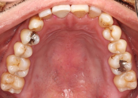 | 診断結果 | 拝見したところ、右上前歯には歯科用プラスチックであるコンポジットレジンが充填されていましたが、 治療途中のまま時間が経過しており、歯の形や噛み合わせが整っていませんでした。 コンポジットレジンは、比較的短時間で処置ができる一方、長期間使用するとすり減りなどの劣化が生じることがあります。 このまま放置すると、さらに劣化したり詰め物が外れたりするリスクがあります。 また、前歯は審美性に大きく影響する部位でもあるため、強度と審美性の両方を考慮した被せ物による修復治療が必要であると診断しました。 |