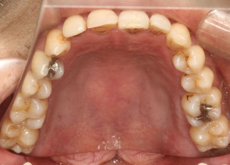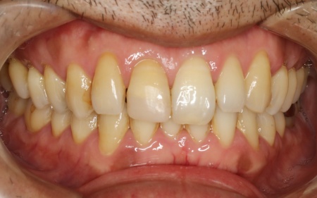 | 行った治療内容 | 診断結果をもとに、前歯を被せ物(クラウン)で修復する治療を提案し、同意いただきました。 被せ物の種類については、以下3つの選択肢をお伝えしています。 ①ジルコニアクラウン:セラミックの中でも強度の高い素材で作製する被せ物 メリット:高い強度と耐久性をもち、壊れにくい デメリット:透明感がやや低く、前歯に使用すると色合いが不自然になるおそれがある ②オールセラミック:すべて白いセラミックで作製する被せ物 メリット:天然歯に近い透明感と色調を再現でき、審美性に優れている デメリット:ジルコニアと比較すると、強度はやや劣る ③ポーセレンビルトアップクラウン:強度の高いフレームの上に、セラミック(ポーセレン)を重ねて作製する被せ物 メリット:色調の再現性が高く、周囲の歯となじみやすい デメリット:噛む力が強い場合、表面のポーセレン部分が欠ける場合がある それぞれの特徴を説明したうえで、患者様は③のポーセレンビルトアップクラウンを選択されました。 また、今回はフレームにはジルコニアを使用し、表面の一部にポーセレンを重ねて作る「カットバッククラウン」という方法で製作します。 この方法なら、ジルコニアの高い強度を保ちながら、ポーセレンによって自然な色のグラデーションを再現することが可能です。 まず既存のコンポジットレジンを除去し、被せ物が合うように歯の形を整えます。その後、ぴったり合う被せ物を作るため歯の型取り(印象採得)を行いました。 被せ物が完成するまでの間は、見た目や噛み合わせを保つために仮歯を作製し、装着しています。 続いて採取した歯型をもとに、歯科技工士がカットバッククラウンを製作しました。被せ物は、患者様の歯の色や噛み合わせを確認しながら仕上げています。 最後に、完成した被せ物を装着し、見た目や噛み合わせに問題がないことを確認して、治療を終了しました。 |