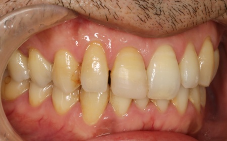| はじめの相談内容 | 「以前、前歯が折れた際、応急処置としてプラスチックの詰め物をしたが、見た目が気になるので治したい」とご相談いただきました。 |